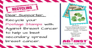 In support of research carried out by “Against Breast Cancer” into secondary breast cancer, Bliss Lingerie has a permanent Bra Bin in the shop for all your old bras (please feel free to drop them off)!! The new project for “Against Breast Cancer” is to collect as many used postage stamps as possible therefore if you can help Bliss Lingerie collect stamps this would be so greatly appreciated!!